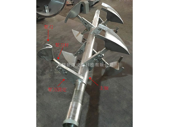 3、犁刀組軸:犁刀根據(jù)容積大小安排犁刀數(shù)據(jù),安裝在主軸上,在筒體內(nèi)作圓周運動混合物料。