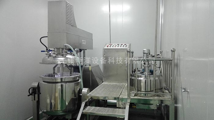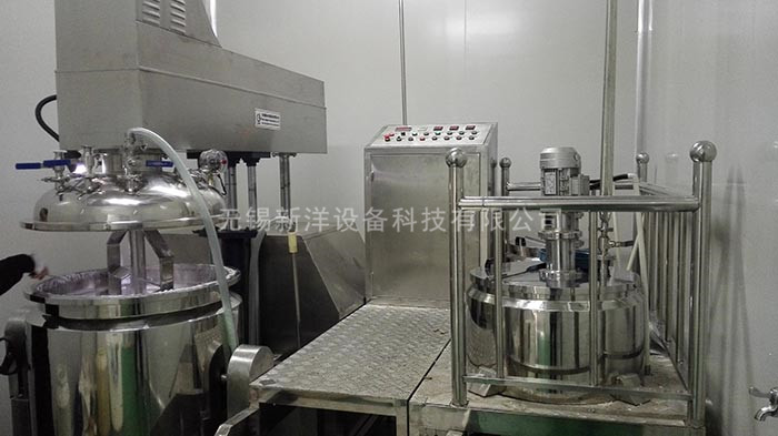 物料在水鍋、油鍋內(nèi)通過加熱、攪拌進(jìn)行混合反應(yīng)后,由真空泵吸入乳化鍋,通過乳化鍋內(nèi)上部的中心攪拌、聚四氟乙烯刮板始終迎合攪拌鍋形體,掃凈掛壁粘料,使被刮取的物料不斷產(chǎn)生新界面,再經(jīng)過葉片的剪斷、壓縮、折疊,使其攪拌、混合而向下流往鍋體下方的均質(zhì)器處,物料再通過高速旋轉(zhuǎn)的切割輪與固定的切割套之間所產(chǎn)生的強(qiáng)力的剪斷、沖擊、亂流等過程,物料在剪切縫中被切割,迅速破碎成200um-0.2um的微粒,由于乳化鍋內(nèi)處于真空狀態(tài),物料在攪拌過程中產(chǎn)生的氣泡被及時抽走。采用抽真空的方式,使所生產(chǎn)的制品在攪拌過程中不再混入氣泡,從而保證可制造出富有光澤、細(xì)膩及延展性良好的產(chǎn)品。
