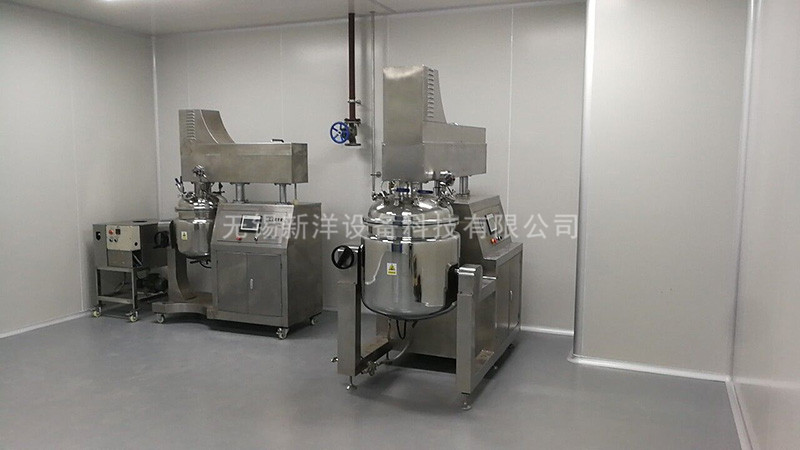 物料在水鍋、油鍋內(nèi)通過加熱、攪拌進行混合反應(yīng)后,由真空泵吸入乳化鍋,通過乳化鍋內(nèi)上部的中心攪拌、聚四氟乙烯刮板始終迎合攪拌鍋形體,掃凈掛壁粘料,使被刮取的物料不斷產(chǎn)生新界面,再經(jīng)過葉片的剪斷、壓縮、折疊,使其攪拌、混合而向下流往鍋體下方的均質(zhì)器處,物料再通過高速旋轉(zhuǎn)的切割輪與固定的切割套之間所產(chǎn)生的強力的剪斷、沖擊、亂流等過程,物料在剪切縫中被切割,迅速破碎成200um-0.2um的微粒,由于乳化鍋內(nèi)處于真空狀態(tài),物料在攪拌過程中產(chǎn)生的氣泡被及時抽走。采用抽真空的方式,使所生產(chǎn)的制品在攪拌過程中不再混入氣泡,從而保證可制造出富有光澤、細(xì)膩及延展性良好的產(chǎn)品。