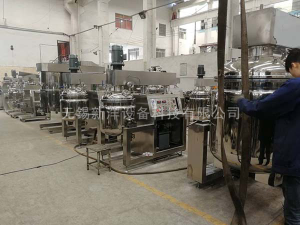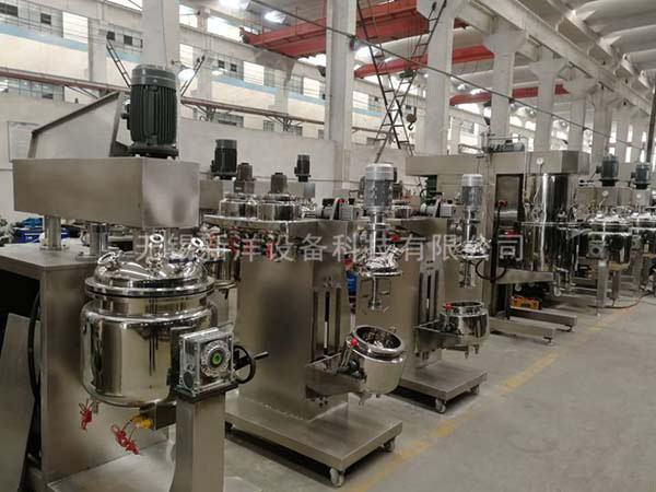 物料在水鍋、油鍋內(nèi)通過加熱、攪拌進行混合反應后,由真空泵吸入乳化鍋,通過乳化鍋內(nèi)上部的中心攪拌、聚四氟乙烯刮板始終迎合攪拌鍋形體,掃凈掛壁粘料,使被刮取的物料不斷產(chǎn)生新界面,再經(jīng)過葉片的剪斷、壓縮、折疊,使其攪拌、混合而向下流往鍋體下方的均質(zhì)器處,物料再通過高速旋轉(zhuǎn)的切割輪與固定的切割套之間所產(chǎn)生的強力的剪斷、沖擊、亂流等過程,物料在剪切縫中被切割,迅速破碎成200um-0.2um的微粒,由于乳化鍋內(nèi)處于真空狀態(tài),物料在攪拌過程中產(chǎn)生的氣泡被及時抽走。采用抽真空的方式,使所生產(chǎn)的制品在攪拌過程中不再混入氣泡,從而保證可制造出富有光澤、細膩及延展性良好的產(chǎn)品。